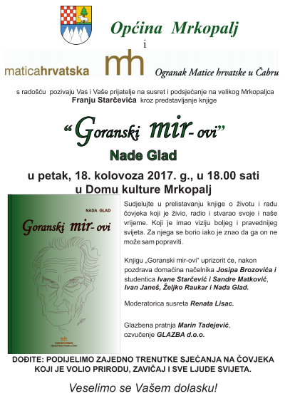 Dana 18. kolovoza 2017. godine (petak), s početkom u 18.00 sati, u Domu kulture Mrkopalj, održat će se predstavljanje knjige pod nazivom „Goranski mir-ovi“. Naime, Općina Mrkopalj i Ogranak Matice hrvatske Čabar organiziraju predstavljanje predmetne knjige u znak sjećanja na velikog Mrkopaljca – Franju Starčevića.