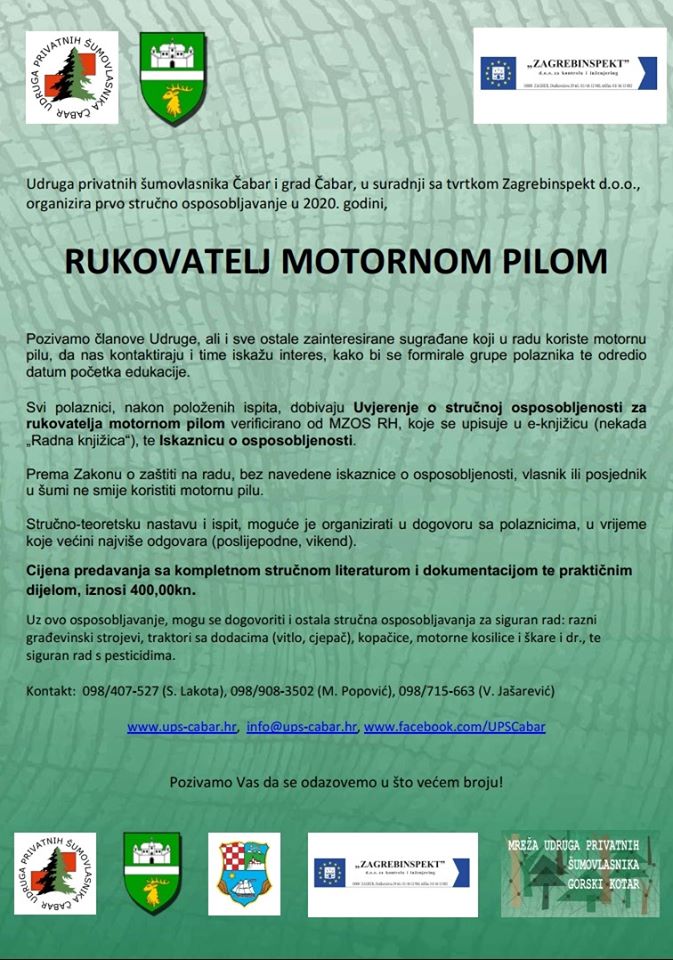 Udruga Privatnih šumovlasnika Čabar, u suradnji s tvrtkom Zagrebinspekt d.o.o., organizira stručno osposobljavanje za rukovatelja motornom pilom.
