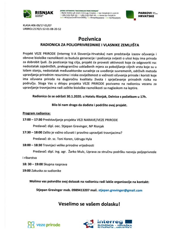 U sklopu projekta „Veze prirode“ u kojem sudjeluje i Nacionalni park Risnjak, održat će se radionica za poljoprivrednike i vlasnike zemljišta na temu upravljanja travnjacima radi zaštite biološke raznolikosti sa naglaskom na leptire.
