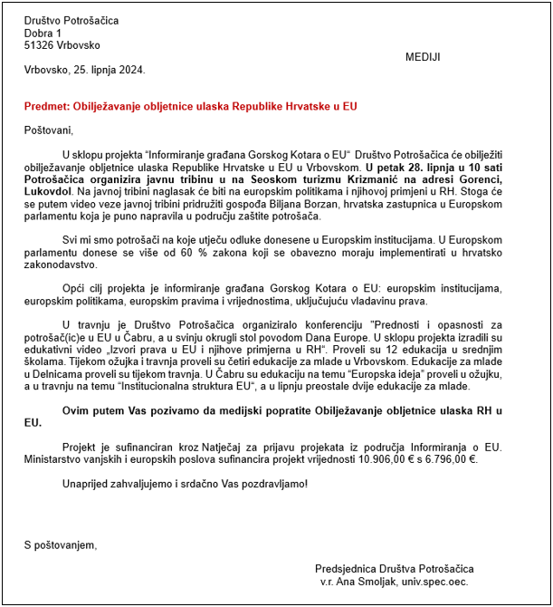 U sklopu projekta “Informiranje građana Gorskog Kotara o EU“  Društvo Potrošačica obilježit će obljetnicu ulaska Republike Hrvatske u EU, dana 28. lipnja 2024. godine (petak), s početkom u 10.00 sati, u Lukovdolu, Seoski turizam Krizmanić.